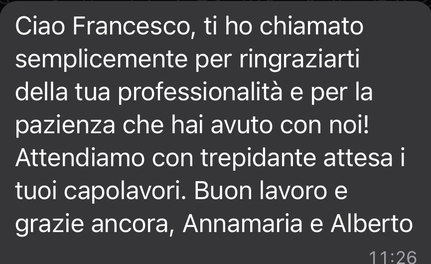 Ora vi lascio con qualche messaggio che le 'mie' coppie mi hanno scritto. Non riporto qui le recensioni che mi hanno scritto su Matrimonio.com piuttosto che sul mio profilo Google, oppure sulla pagina Facebook. Vi metto alcuni screenshot di messaggi whatsapp che mi hanno inviato subito dopo il matrimonio, così che possiate percepire come in quel giorno sono solito lavorare, e che in questo articolo non vi ho raccontato palle... ๐ช๐ป๐